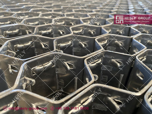 Hex-mesh: Pronges/Lances Type this style has lance tabs protruding from the walls of the hexagonal cell to act as anchorage for the refractory.